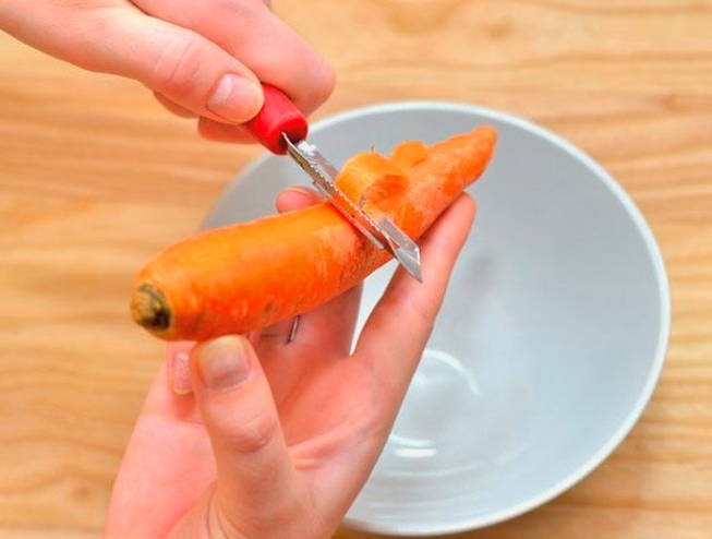 - Schil de wortelen van de bovenste laag. We spoelen het grondig van vuil, terwijl we onszelf helpen met een borstel of spons. Dep de wortelen met keukenpapier om overtollig vocht te absorberen. Snijd de wortel in halve ringen.
