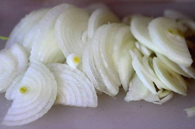 - We verwijderen de schil van de ui. Snijd in twee delen en maal elk in halve ringen.