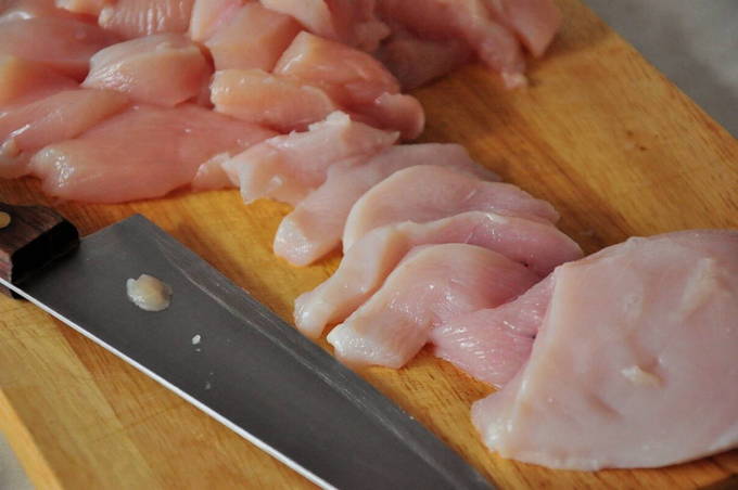 - We verwerken de kippenborst: we verwijderen films en aderen. We spoelen het af met koud water en drogen het af met een papieren handdoek. Snijd de kip in kleine stukjes.