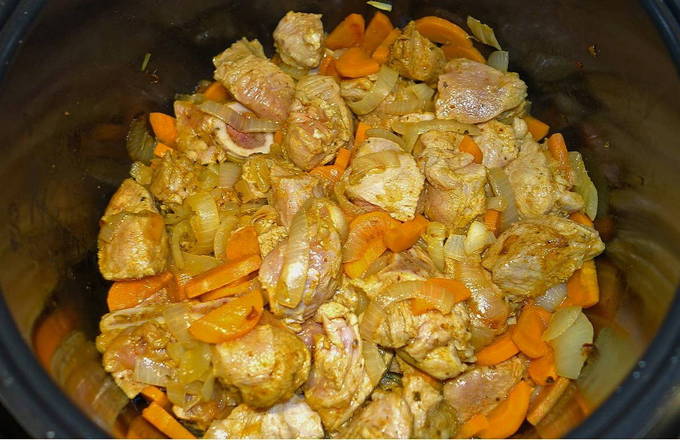 - Leg na 3 minuten de kipfilet neer. Zout en bestrooi de ingrediënten met kruiden, meng ze tot een gladde massa. Schenk de helft van het water in het glas. Giet het in een koekenpan, die we afdekken met een deksel. We laten 5 minuten sudderen.