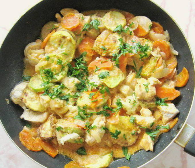 Het gerecht wordt beschouwd als een dieetgerecht, omdat gestoofde courgette een minimale hoeveelheid calorieën bevat. Ze worden geadviseerd om zo nodig te eten om een bepaald dieet te volgen. Voor een meer bevredigende maaltijd kunt u kipfilet toevoegen.