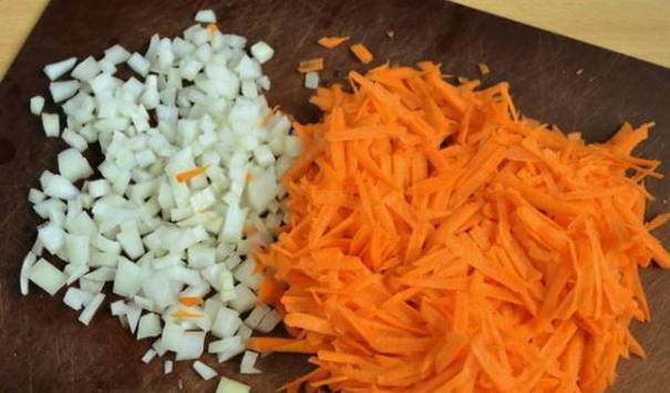 Laten we de uien en wortels voorbereiden om te frituren. We schillen de ui, snijden hem in twee delen. Maal elk deel in kleine blokjes. Ook maken we de wortelen schoon en spoelen ze af met warm water om vuil te verwijderen. We wrijven het op een grove rasp in een diepe kom.