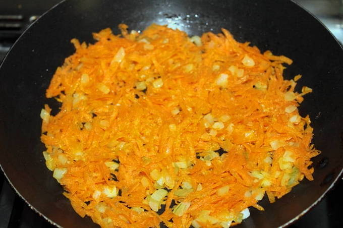 - Giet plantaardige olie in een diepe koekenpan. We zetten de container op de brander en zetten het fornuis aan. Verwarm ongeveer een minuut en voeg de ui toe. Bak het goudbruin. Vervolgens sturen we wortelen. Roer dit door de ui en bak een paar minuten tot de wortelen zacht zijn.