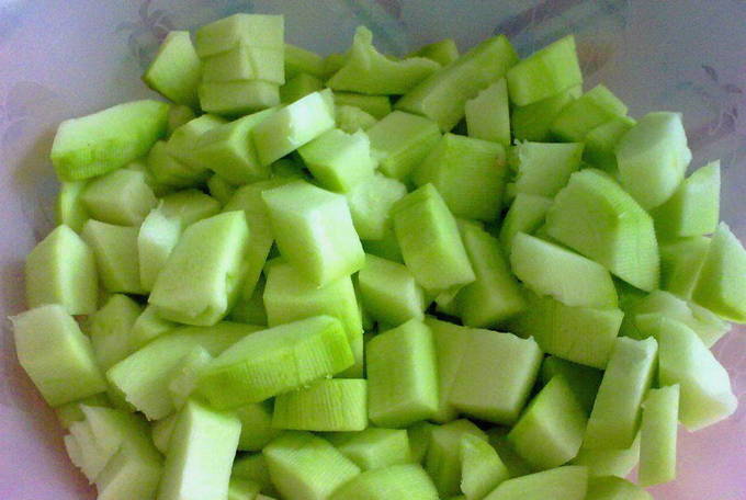 - We spoelen de courgette af met warm water en vegen hem af met een theedoek. Verwijder de schil met een mes. Als de courgette jong is, mag de schil niet worden verwijderd, omdat deze erg dun en sappig is. Boen de courgettekern schoon met een lepel. Snijd de courgette in middelgrote blokjes.