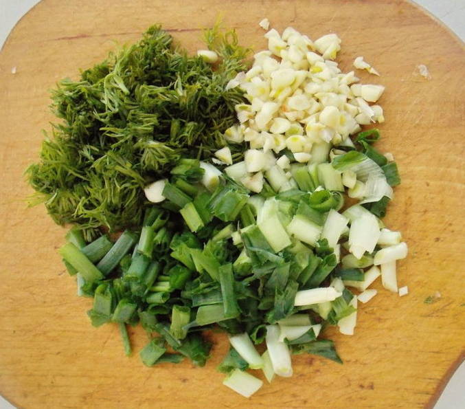 Laten we voor de rest van de ingrediënten zorgen. Spoel de greens af en droog ze af met keukenpapier. Hak fijn. Maak de knoflook los van de schil. We snijden het ook in kleine stukjes. Doe de knoflook en de helft van de kruiden in de pan. Giet zure room, zout en peper. Roer de inhoud van de container tot een gladde massa en kook nog eens 10-15 minuten.