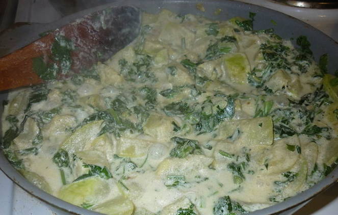 - Giet er na een paar minuten de zure room bij. Zout de saus en roer tot een gladde saus. Schenk de saus over de courgette. Dek de pan af en laat 40 minuten sudderen.