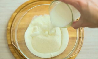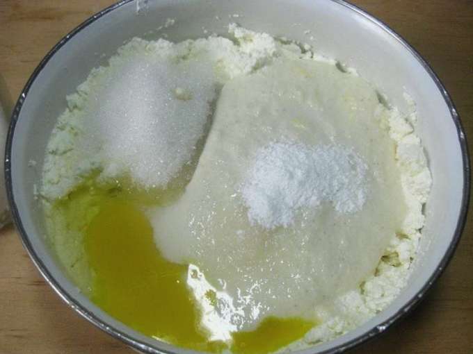 - Combineer kwark, twee soorten suiker en eieren in een diepe kom. Giet kefir bij de ingrediënten en roer.