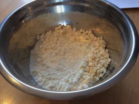 - We malen de kwark en doen deze in een diepe kom. We sturen hier ook twee soorten suiker, een ei, bakpoeder en gezwollen griesmeel. Roeren.