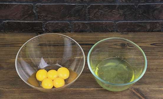 - Breek de eieren voorzichtig en scheid het eiwit van de dooiers.