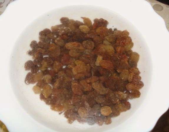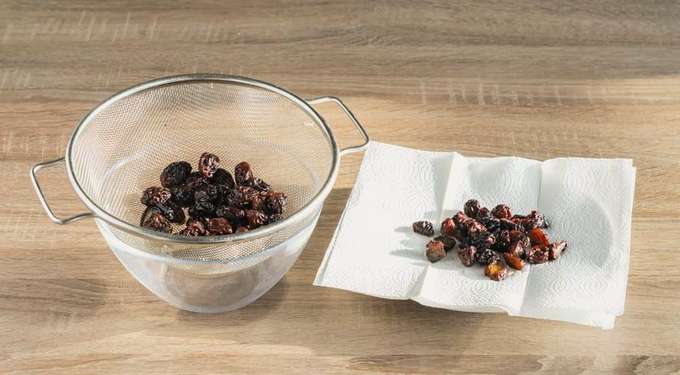 - Week de rozijnen in koud water, doe ze in een zeef en laat ze drogen. Kan op een papieren handdoek worden geplaatst.