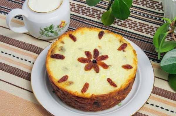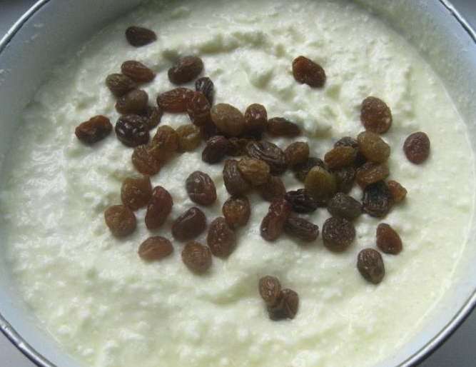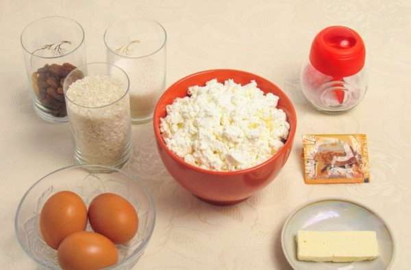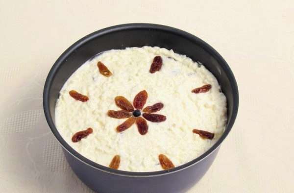 - Doe de kwark en het rijstdeeg in een ovenschaal. Het oppervlak kan worden versierd met rozijnen. We sturen het 45 minuten naar de oven, voorverwarmd tot 180.