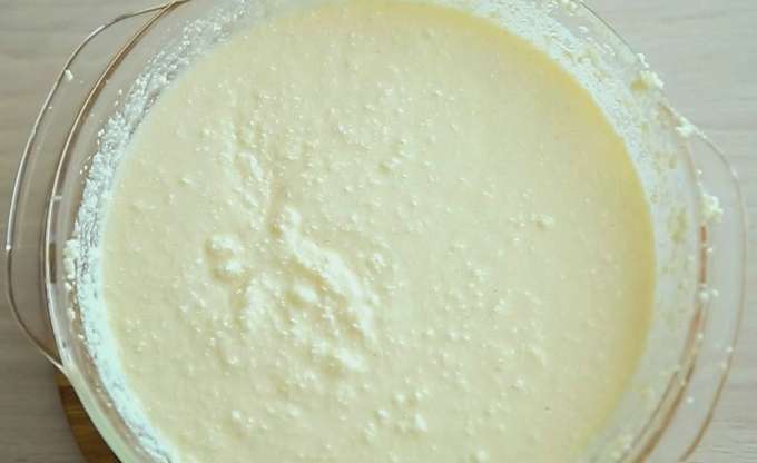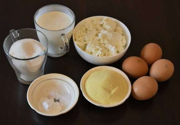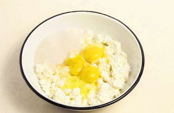 - Voeg griesmeel, zure room, kwark en bakpoeder toe aan de massa. Klop opnieuw.