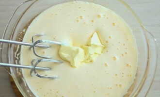 Voeg zachte boter toe aan de eiermassa. Roer de massa.