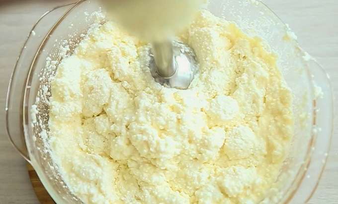 - We malen de kwark goed en leggen deze op een bord dat handig is om te roeren. Voeg er zachte boter aan toe. Laat een klein stukje over om de vorm in te vetten.