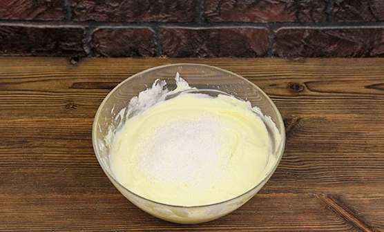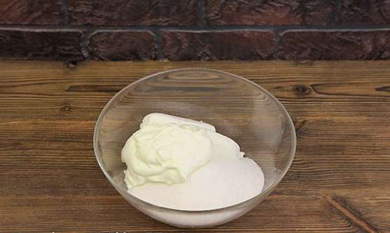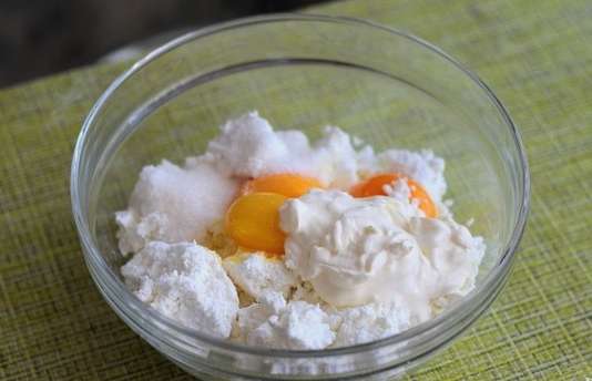 - Voeg twee soorten suiker toe aan de dooiers, zetmeel, kwark en zure room.