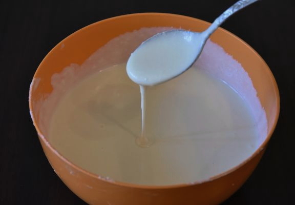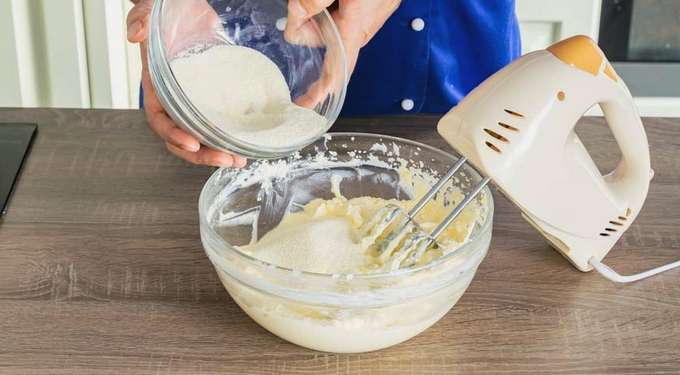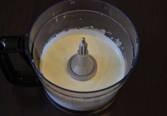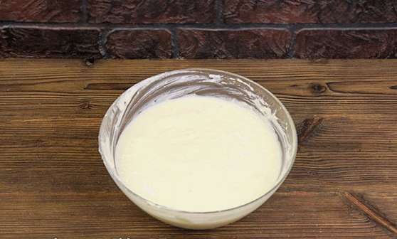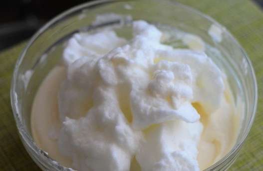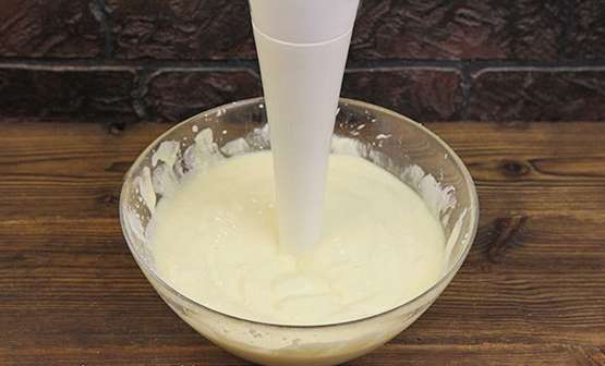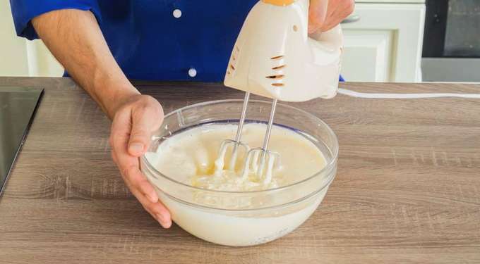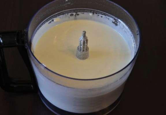 - Klop de producten tot een homogene luchtmassa. Het is handig om hiervoor een staafmixer te gebruiken.
