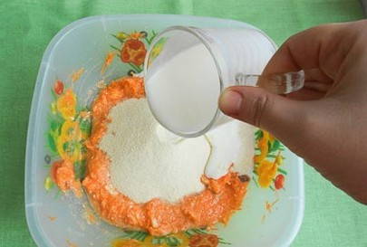 Giet melk met griesmeel. Roer het deeg. Het moet een beetje vloeibaar blijken te zijn.