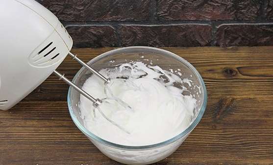 - Haal de eiwitten terug uit de koelkast en klop ze tot dikke en stabiele pieken.
