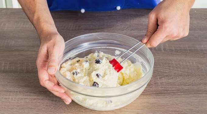 - Voeg gedroogd fruit toe aan de wrongelmassa en roer opnieuw.