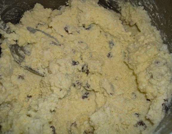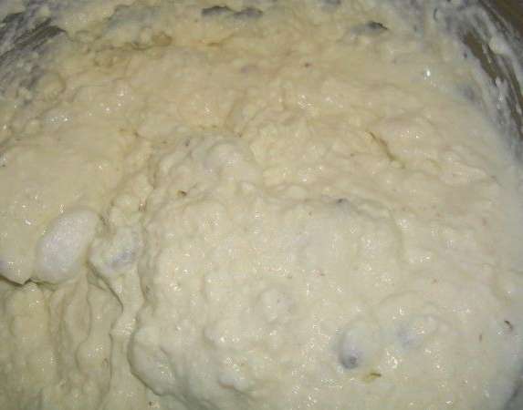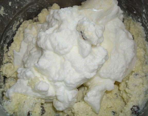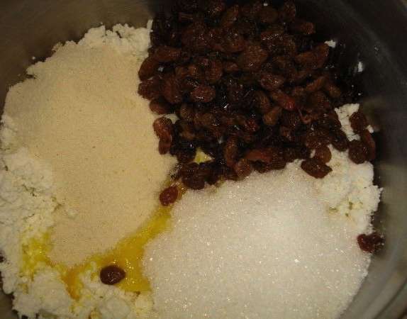 - Meng in een diepe kom gestampte kwark, suiker, dooiers, griesmeel en rozijnen.