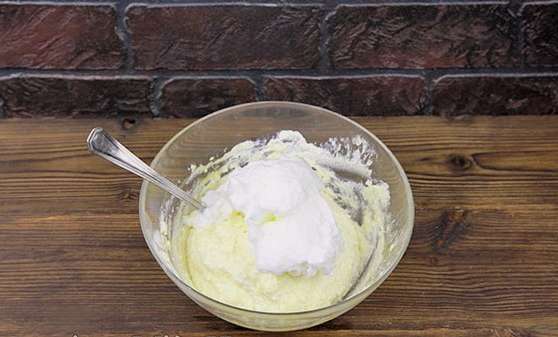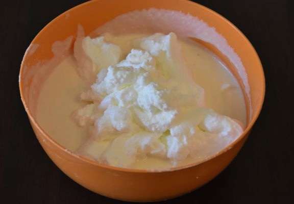 - Klop de blanken met zout tot dik schuim en doe ze in het algemene mengsel. Meng voorzichtig met een spatel.