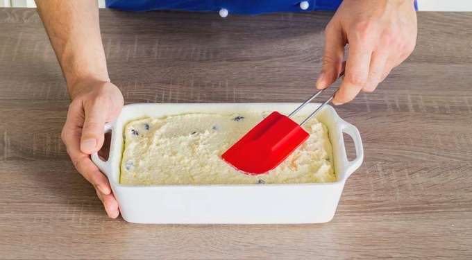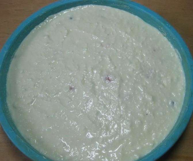 - Vet de ovenschaal goed in met boter. Als je bang bent om te verbranden, bestrooi dan de bodem met een snufje griesmeel. Giet het deeg in een vorm en egaliseer het oppervlak.
