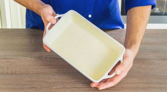 - Bedek de ovenschaal met de resterende boter.Om het gerecht tegen aanbranden te beschermen, kunt u een paar snufjes griesmeel toevoegen.