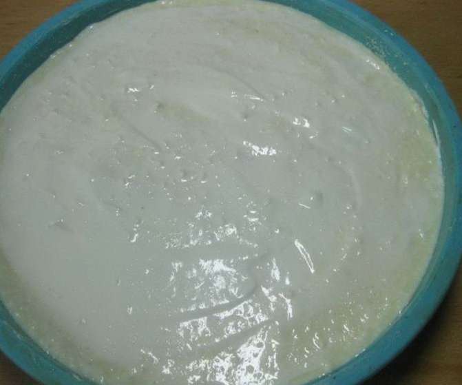- Bedek de bovenkant van de wrongelmassa met de resterende zure room.