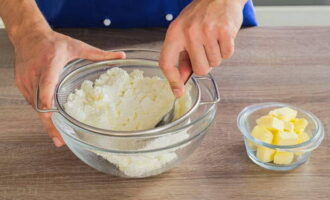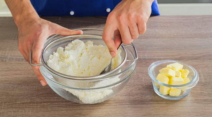 Wrijf de kwark door een fijne zeef. Snijd de boter in blokjes en laat een beetje smelten.