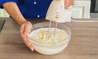 Voeg melk, gesmolten boter en 150 gram griesmeel toe. Klop opnieuw tot een gladde massa.