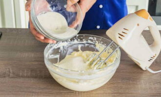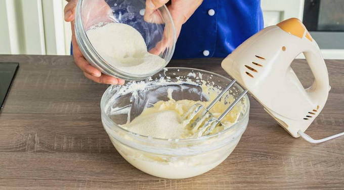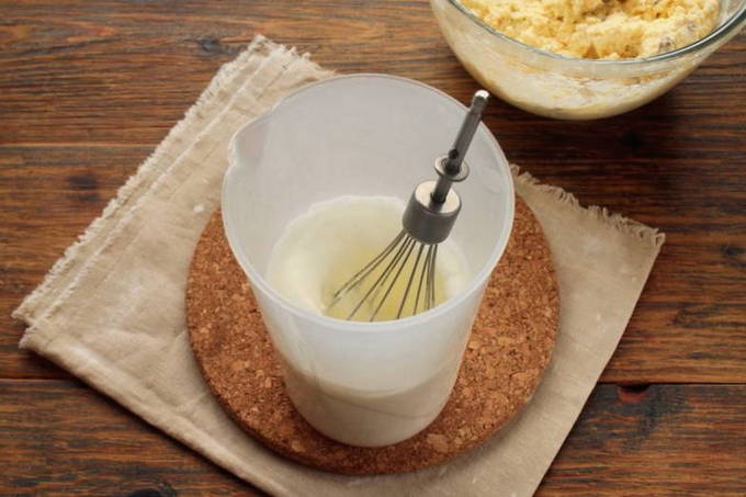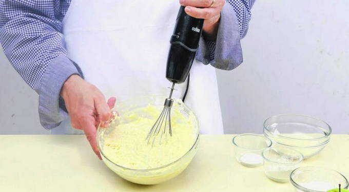 - Combineer kwark, eidooiers en suiker in een gemeenschappelijke kom. We zetten de eiwitten even opzij.