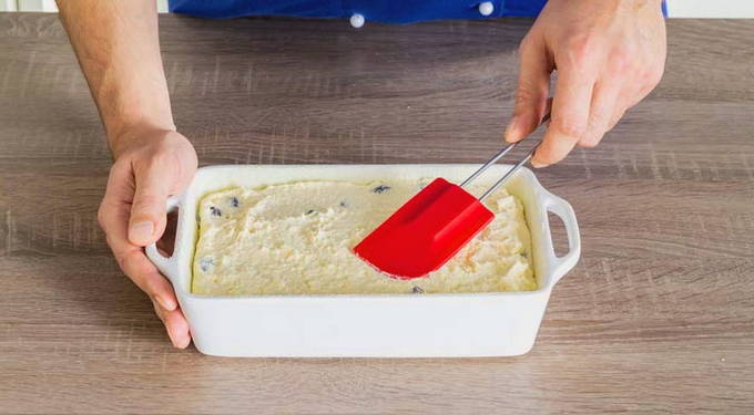 - Roer het deeg met een spatel en breng het over in een ovenschaal. Bak 45 minuten op 180 graden.
