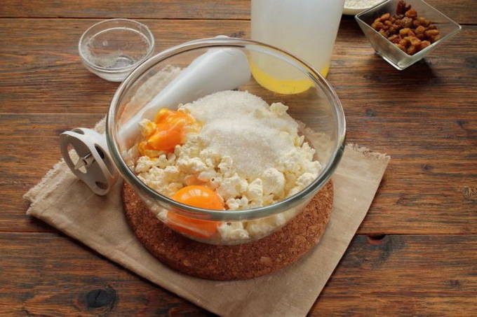 - Verspreid de kwark geleidelijk in de resulterende massa. We blijven kloppen tot het glad is. Roer op het einde de rozijnen erdoor.