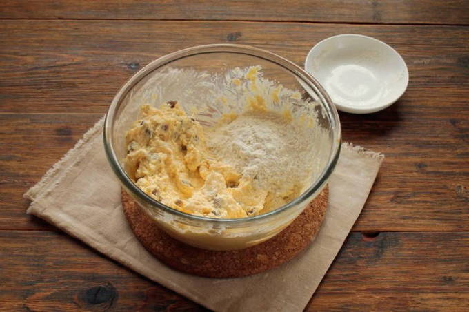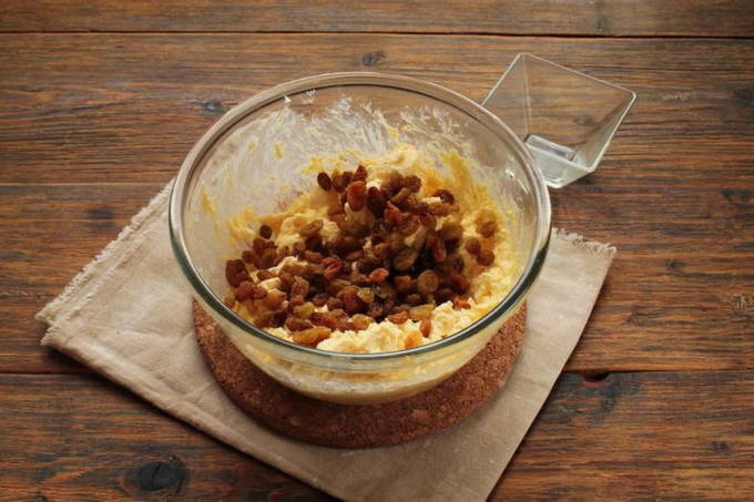 We vullen het deeg aan met rozijnen. Roer het voedsel voorzichtig om met een spatel.