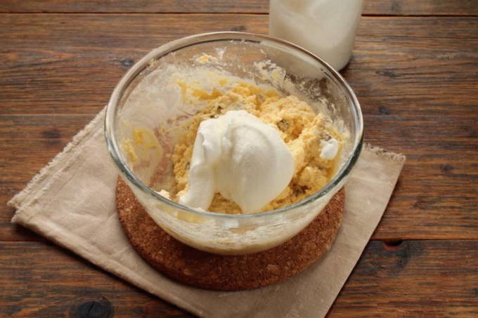 - We verspreiden zure room, suiker, bloem en bakpoeder op de wrongel. Kneed tot een gladde massa. Je zou een dun deeg moeten krijgen.