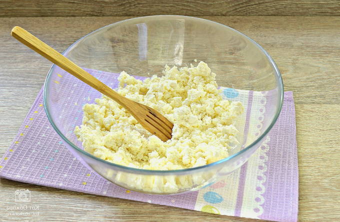 - Maal kwark met kippeneieren en voeg dan griesmeel en suiker toe. Roer tot een gladde massa en laat een tijdje staan zodat de cornflakes opzwellen.