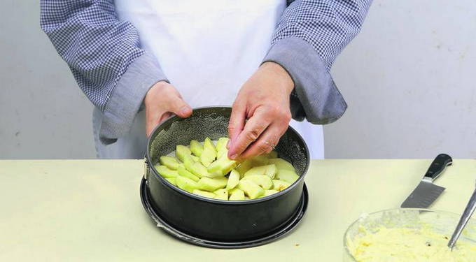 Leg het deeg hier voorzichtig op. We sturen het 40-45 minuten naar een voorverwarmde oven op 180 graden.