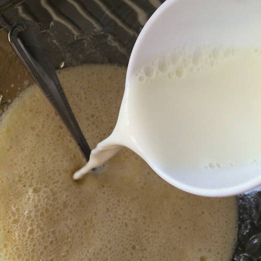 Melk wordt voorzichtig in de massa gegoten en gemengd.