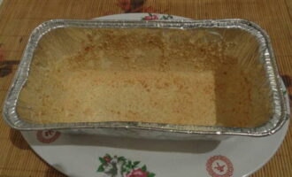 Vet een diepe ovenschaal in met boter, bestrooi met griesmeel en verdeel de resulterende massa, laat het deeg 20 minuten binnen staan.