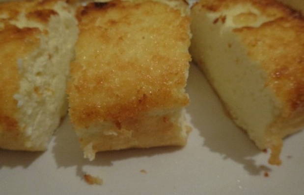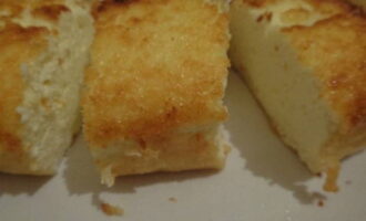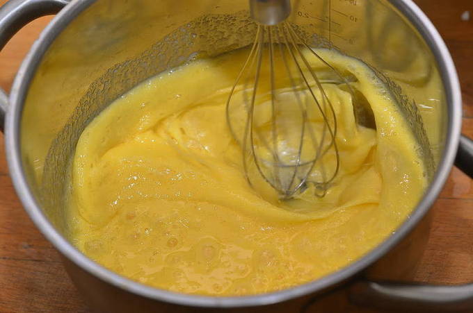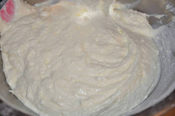 Eieren worden met suiker en zout geslagen tot een luchtige massa. Kwark en griesmeel worden aan het eiermengsel toegevoegd.
