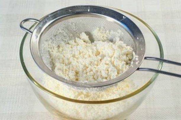 Kwark wordt gemalen door een zeef of geklopt met een blender om de consistentie van het afgewerkte gerecht malser te maken.