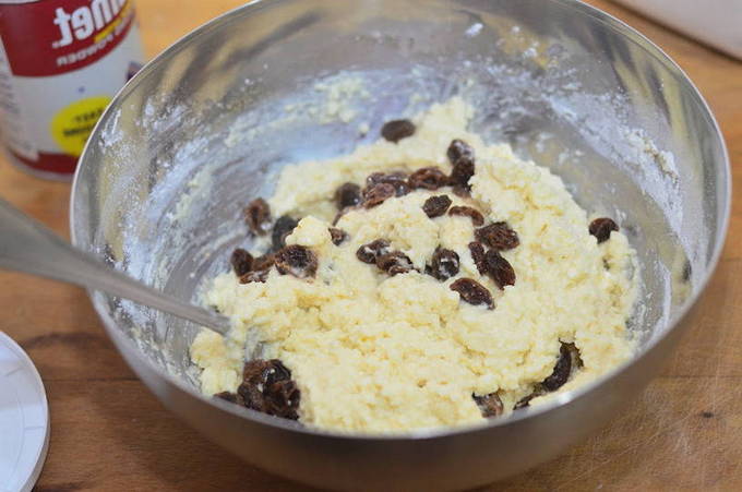 - Giet de rozijnen met heet water en laat 10 minuten staan, knijp ze dan licht uit en voeg toe aan het wrongeldeeg.