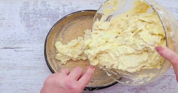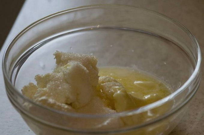 - Kwark en boter worden gemengd in een diepe container. Het is belangrijk dat de boter niet gesmolten is, anders wordt de braadpan niet zoals het hoort.