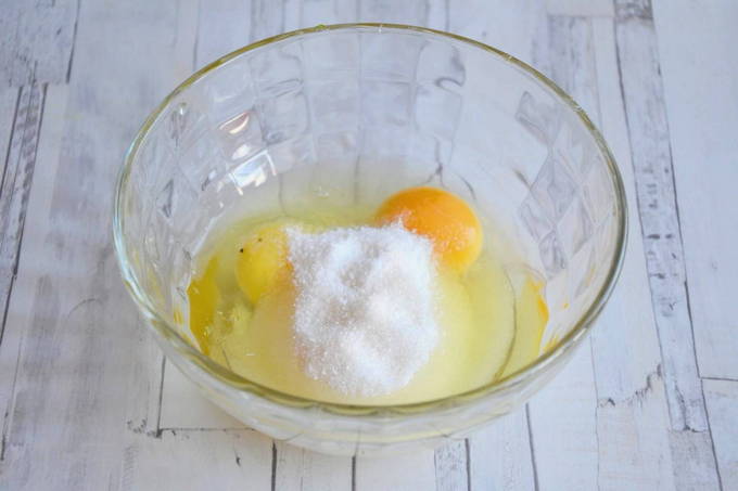 - Klop eieren met suiker.Om dit te doen, kunt u een garde of vork gebruiken.