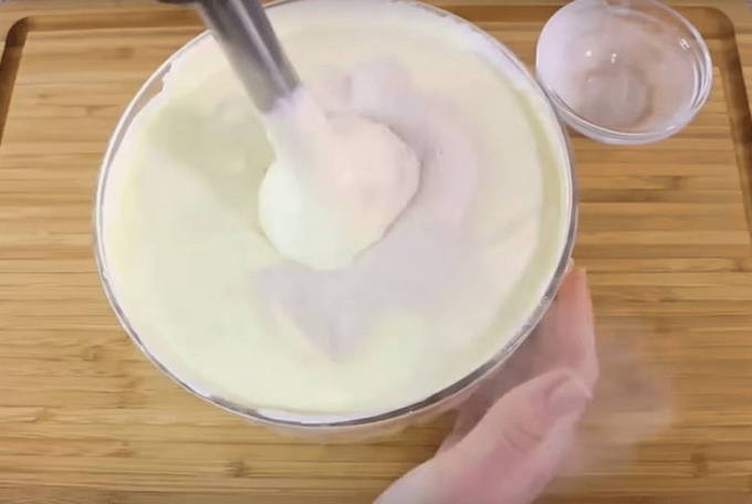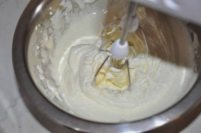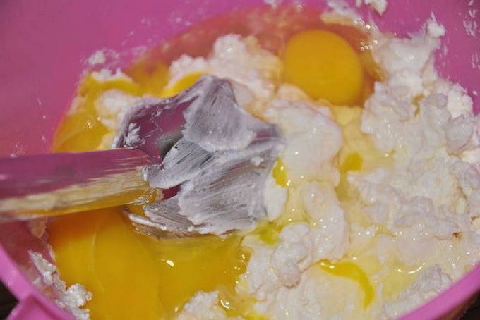 - Klop eieren, kwark en zoetstof apart, het is beter om dit met een blender te doen en voeg dan de massa toe aan griesmeel gemengd met zure room.