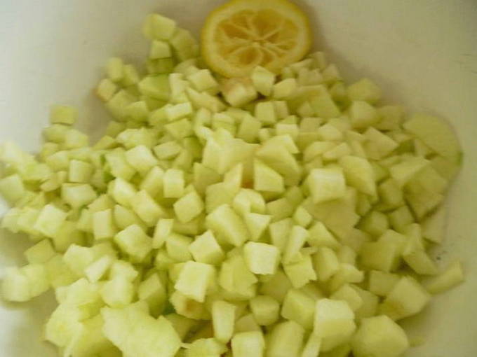 - De schil wordt van de appels gesneden, het klokhuis wordt verwijderd en het fruit wordt in kleine blokjes gesneden en vervolgens gemengd met de wrongelmassa.