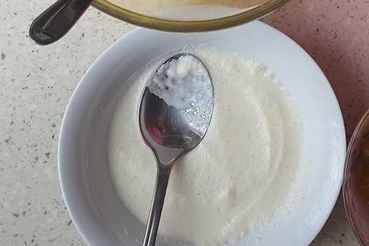 - Het eiermengsel wordt in de wrongelmassa gegoten, griesmeel wordt toegevoegd en snel gemengd. Je zou een glad wrongeldeeg moeten krijgen.
