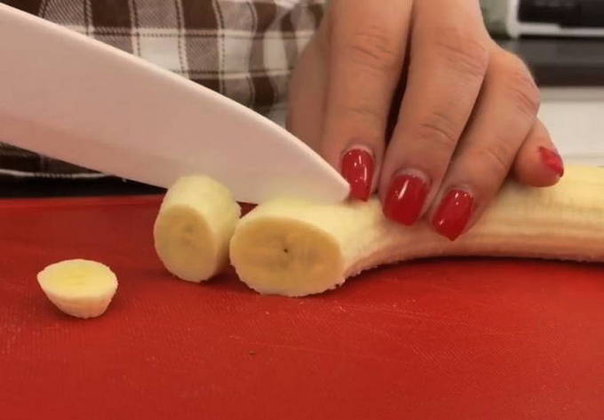- De banaan wordt geschild en in dunne plakjes gesneden.