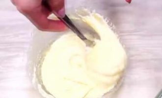 Voeg kristalsuiker, zure room en griesmeel toe aan de boter. Meng alles goed, voeg dan vanilline toe aan het mengsel en meng de ingrediënten opnieuw.