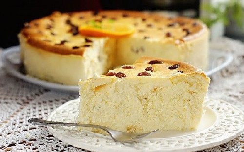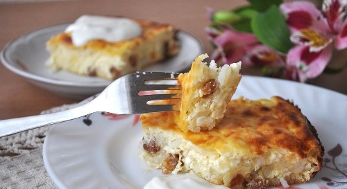 - Voeg vervolgens afgekoelde gedroogde rijst, rozijnen toe aan de wrongel en meng voorzichtig. Vet een ovenschaal in met boter, leg daar het wrongelmengsel en strijk de bovenkant glad.
